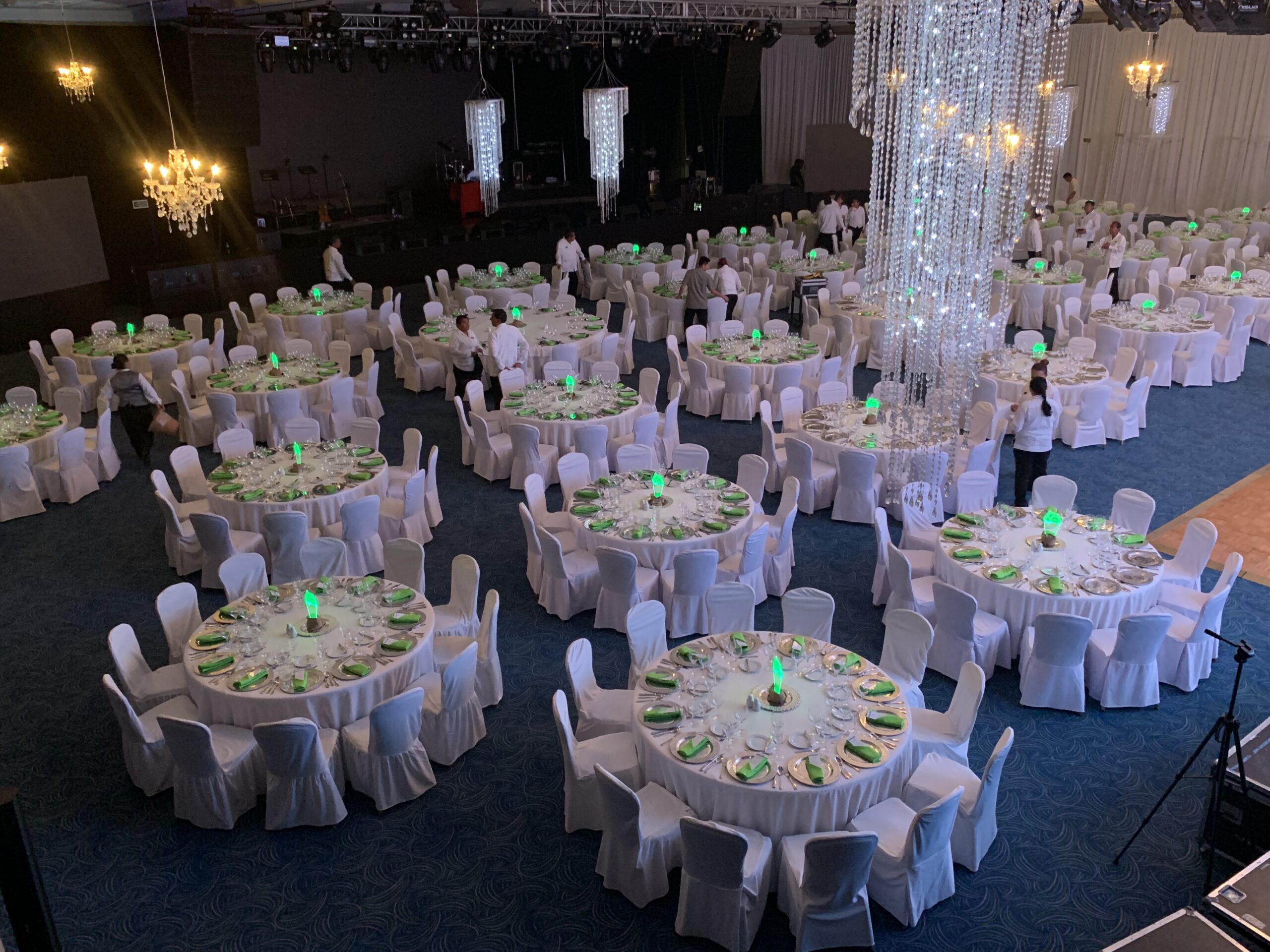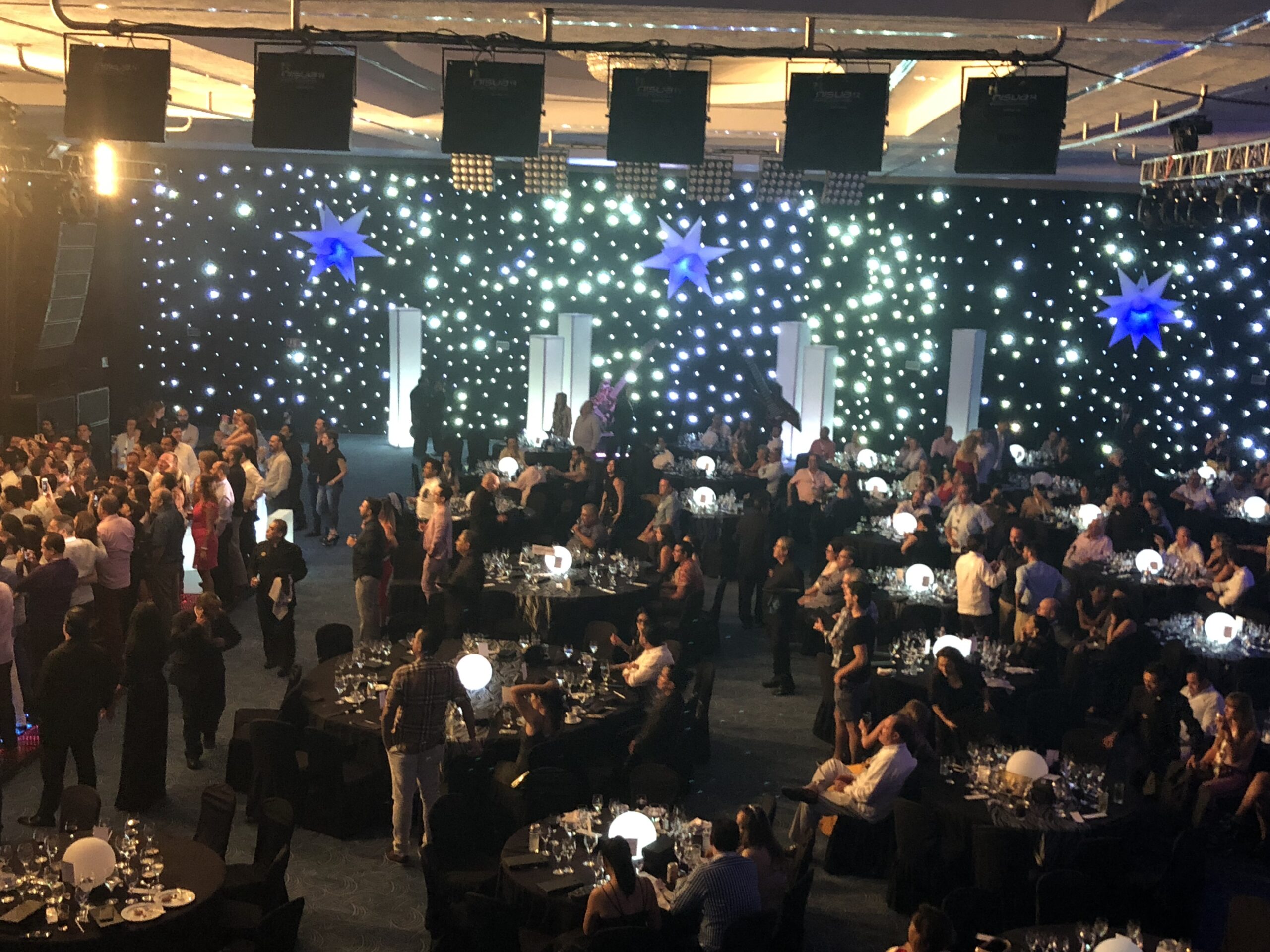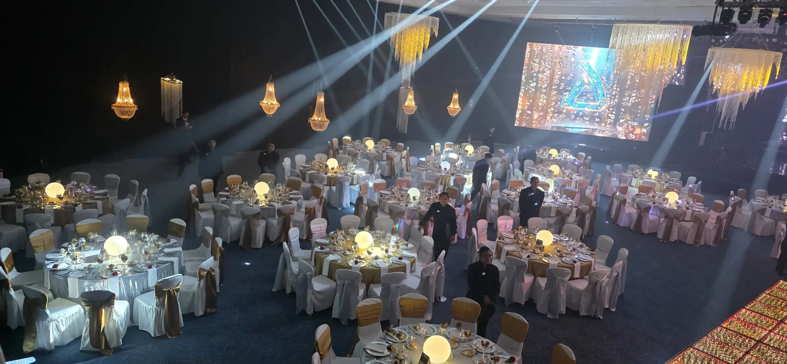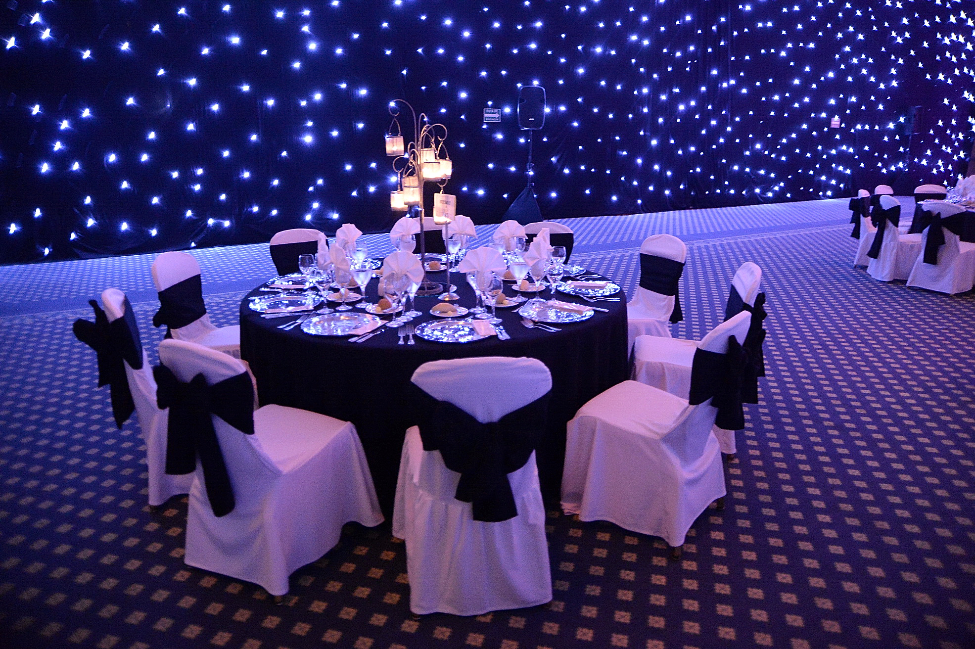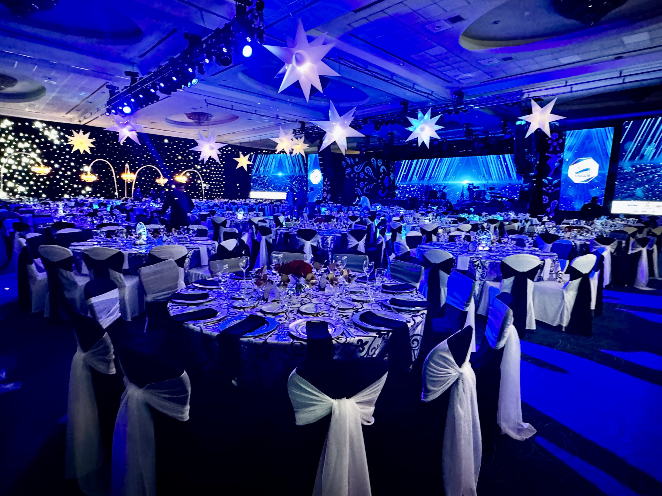 Juegos de luces, reflejos brillantes, elementos colgantes y decoración en tonos metálicos crean un escenario espectacular que simula estrellas, cristales flotantes y un ambiente de ensueño.